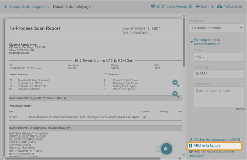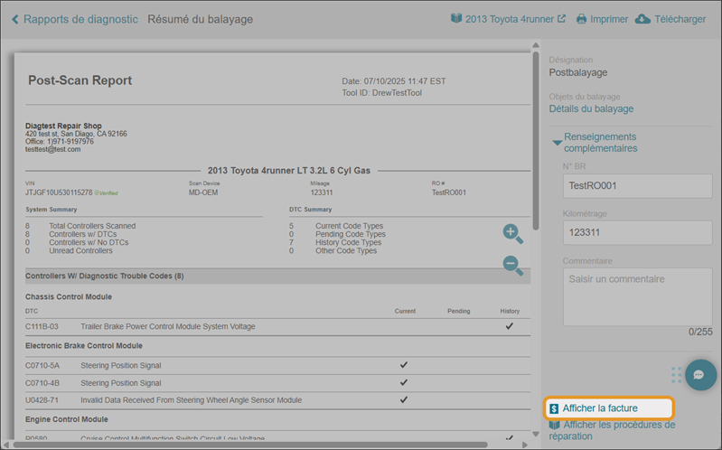 Affichez une facture pour tout balayage de diagnostic dans Mitchell Connect.