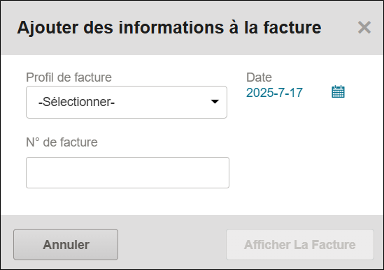 - Dans la fenêtre Ajouter de l’information à la facture, saisissez un numéro de facture dans le champ N° de facture. La date de la facture est par défaut la date du jour. Si vous souhaitez modifier la date, cliquez sur
