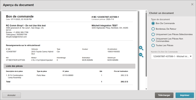 Commander des pièces et générer une liste de pièces dans Mitchell Cloud Repair