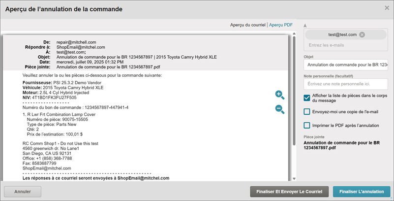 Dans la fenêtre Aperçu de l’annulation de la commande, révisez et modifiez les champs du courriel au besoin :