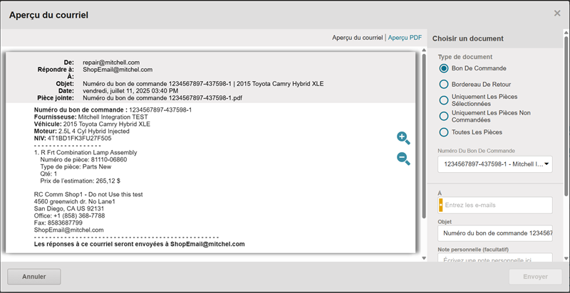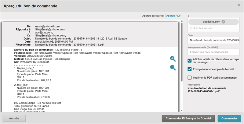 Dans la fenêtre Aperçu du bon de commande, passez en revue et modifiez les champs Courriel au besoin :