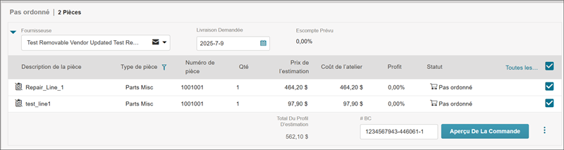 dans le champ Livraison demandée pour choisir une nouvelle date. - Toutes les pièces énumérées sont sélectionnées par défaut. Décochez les cases à côté des pièces que vous ne souhaitez pas commander.