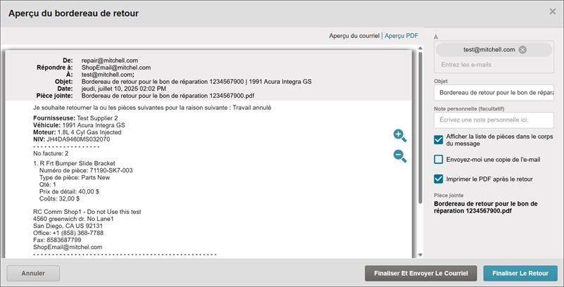 Utilisez la page Gestion des pièces pour simplifier le processus de réception, de retour et de publication des factures pour les pièces commandées. Le flux de travail comprend les nouvelles fonctionnalités suivantes :
