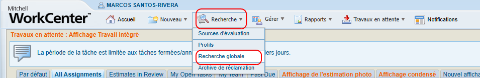 You can view the search results on the page. Select the appropriate tab to view the results in the Claims, Estimates, Assignments, or Total Loss lists.