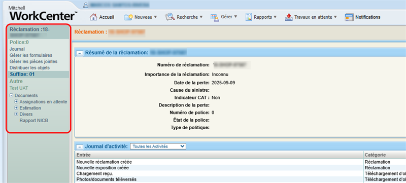 Use the claim navigation pane to view all reports, worksheets, photos, journal messages, and other items associated with a claim. The claim navigation pane displays on the left side of the workspace when you view a claim.