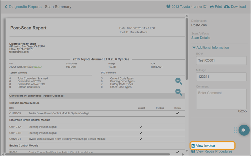 View an invoice for any diagnostics scan in Mitchell Connect.