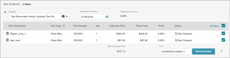 Purchase Order (If available): Generate a purchase order of ordered parts. Select a specific purchase order in the Purchase Order # list.