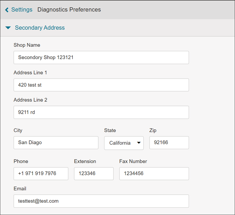 Note: Existing Diagnostic Reports uploaded to the insurance company continue to show shop information from the General Information page, regardless of the new secondary address configuration. This ensures the integrity and consistency of prior report data.